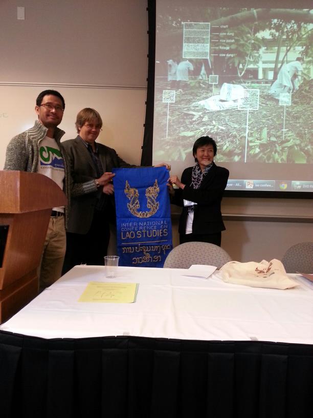 The closing ceremony took place on Sunday morning from 12:40-1:00pm, with remarks and appreciations from Co-Chairs Ian Baird and Vinya Sysamouth. Following, Dr. Baird spoke about the passing of Roger Rumpf, who played an important role in Laos in the late 1970s as the representative of Quaker Service Laos (together with his wife Jacqui Chagnon), and up until recently, and Dr. Katherine Bowie, Director of the Center for Southeast Asian Studies (CSEAS) at UW-Madison, who talked about the CSEAS and provided insight on how ICLS participants could make the most of their visit in the city of Madison. This was followed by the official passing of the gold thread-embroidered flag of the Lao Studies conference logo (made by Tiao Somsanith Nithakhong) from the current Conference host to the next Conference host: Thammasat University, Bangkok, Thailand. Dr. Varisa Kamalanavin, gave an acceptance speech and showed a video about Thammasat University. The Center for Lao Studies and Thammasat University will work closely together to organize the next conference in 2016.